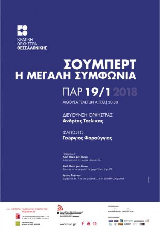 Η Κρατική Ορχήστρα Θεσσαλονίκης παρουσιάζει την «Μεγάλη Συμφωνία» του Σούμπερτ, ένα μεγαλειώδες έργο που ο δημιουργός του εμπνεύστηκε από την «Ενάτη» του Μπετόβεν, του συνθέτη που αποτελούσε το ίνδαλμά του και καθόρισε όσο κανείς άλλος τη συνθετική του πορεία. Το έργο αποτελεί πρόκληση για κάθε συμφωνική ορχήστρα λόγω των υψηλών δεξιοτεχνικών του απαιτήσεων και των εξαιρετικά εκτεταμένων μερών και των εγχόρδων και των πνευστών.
