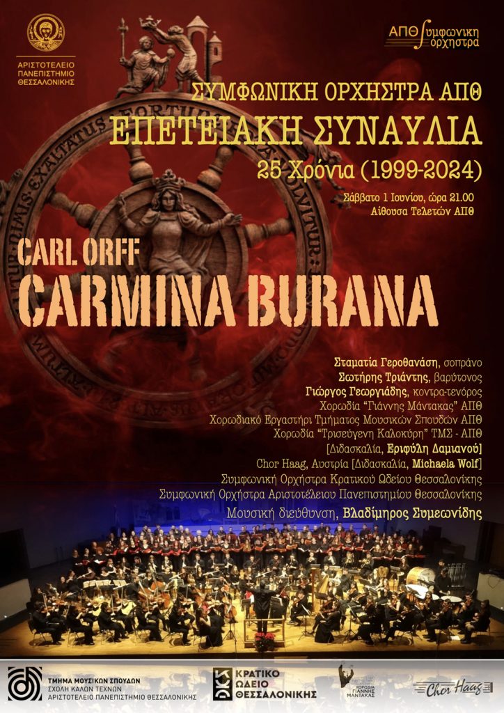 Η Συμφωνική Ορχήστρα ΑΠΘ, με αφορμή τη συμπλήρωση 25 χρόνων από την ίδρυσή της, διοργανώνει δύο επετειακές Συναυλίες, με το έργο CARMINA BURANA του Carl Orff, το Σάββατο