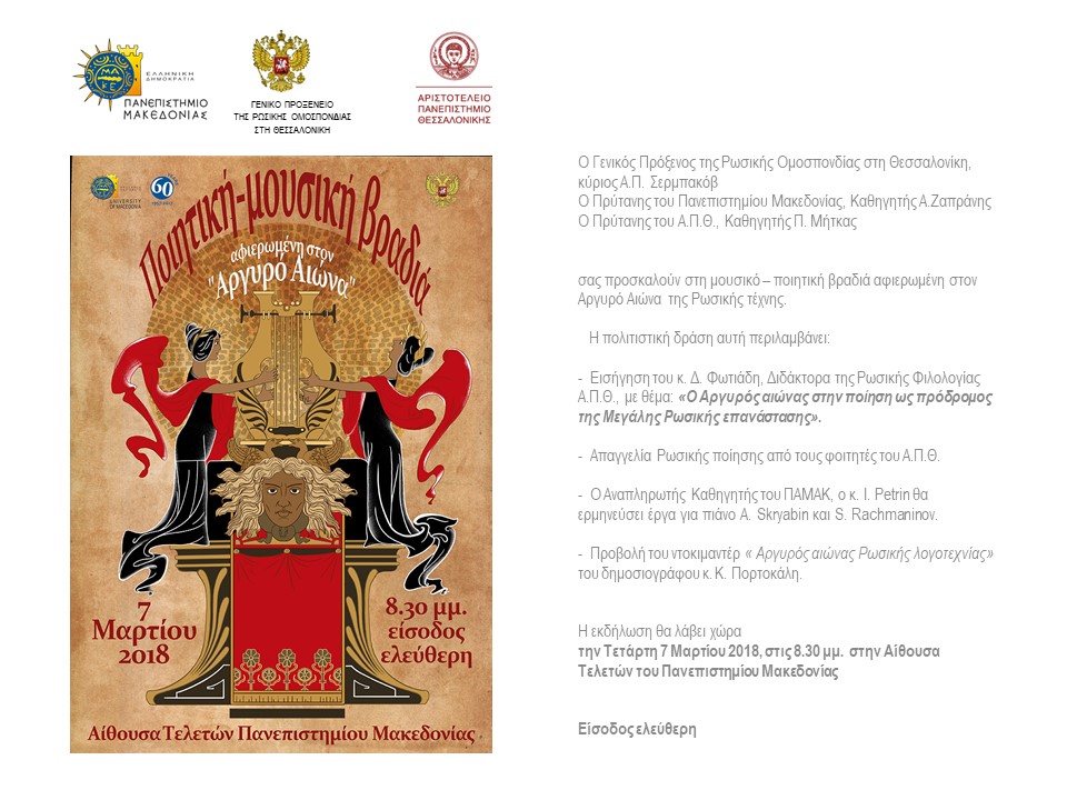 – Εισήγηση του κ. Δ. Φωτιάδη, Διδάκτορα της Ρωσικής Φιλολογίας Α.Π.Θ., με θέμα: «Ο Αργυρός αιώνας στην ποίηση ως πρόδρομος της Μεγάλης Ρωσικής επανάστασης».