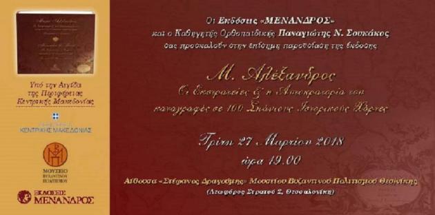 Στις 27 Μαρτίου, ημέρα Τρίτη και ώρα 7μμ, θα γίνει από τις εκδόσεις Μένανδρος στην αίθουσα «Στέφανος Δραγούμης»  του Βυζαντινού Μουσείου Θεσσαλονίκης η παρουσίαση του βιβλίου του ομότιμου Καθηγ. Ορθοπαιδικής  του ΕΚΠΑ Π. Σουκάκου, που αφορά στο χαρτογραφικό έργο κατά την εποχή του Μ. Αλεξάνδρου και των Επιγόνων.