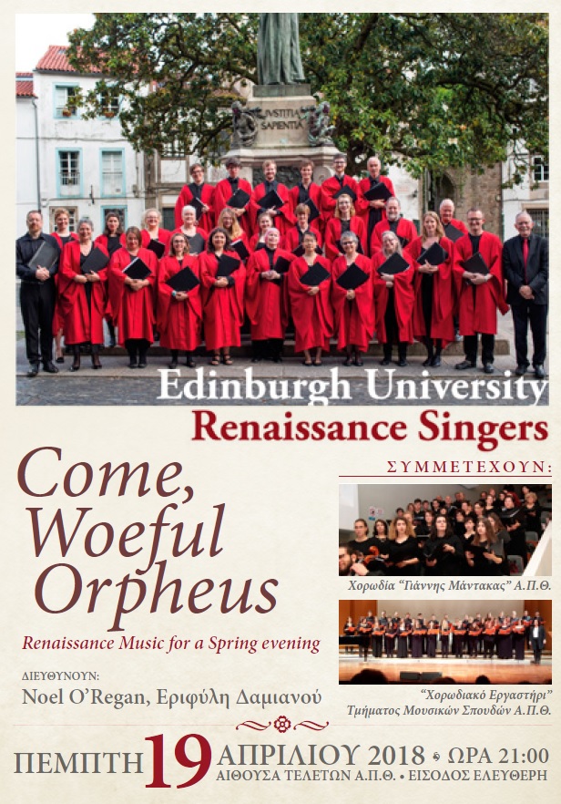 Το Τμήμα Μουσικών Σπουδών και η Χορωδία «Γιάννης Μάντακας» του Αριστοτελείου Πανεπιστημίου Θεσσαλονίκης, υποδέχονται τη Χορωδία “Edinburgh University Renaissance Singers” και συμπράττουν μαζί της σε συναυλία που θα γίνει την Πέμπτη 19 Απριλίου 2018, ώρα 9 μ.μ. στην Αίθουσα Τελετών του Α.Π.Θ.