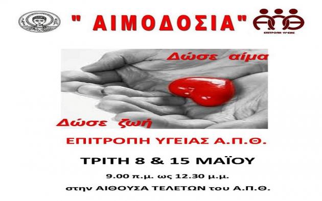 Η Επιτροπή Υγείας του Α.Π.Θ. καλεί όλα τα Μέλη της Πανεπιστημιακής Κοινότητας στην Εθελοντική Αιμοδοσία, που διοργανώνει και παρακαλεί για την προώθηση της σχετικής πληροφόρησης, συμβάλλοντας έτσι καθοριστικά στην ευαισθητοποίηση στο ιδιαίτερα σημαντικό αυτό θέμα.