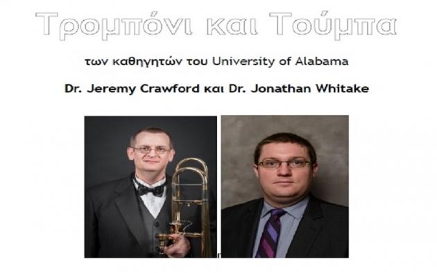 Το Tμήμα Μουσικών Σπουδών του Αριστοτελείου Πανεπιστημίου Θεσσαλονίκης στα πλαίσια της συνεργασίας του Α.Π.Θ. με το University of Alabama (Alabama Greece Initiative) διοργανώνει μια ιδιαίτερα ενδιαφέρουσα συναυλία για τρομπόνι και τούμπα, τα βαθύφωνα όργανα της ορχήστρας, των καθηγητών του University of Alabama Dr. Jeremy Crawford και Dr. Jonathan Whitake την Πέμπτη 10 Μαΐου 2018, 9:00 μ.μ. στην αίθουσα δοκιμών της Κ.Ο.Θ «Σόλων Μιχαηλίδης», Λεωφόρος Νίκης 73.