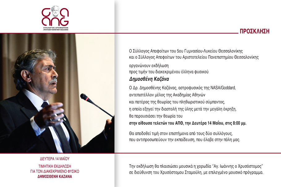 Ο Σύλλογος Αποφοίτων του 5ου Γυμνασίου-Λυκείου Θεσσαλονίκης και ο Σύλλογος Αποφοίτων του Αριστοτελείου Πανεπιστημίου Θεσσαλονίκης (ΑΠΘ) οργανώνουν εκδήλωση προς τιμήν του διακεκριμένου έλληνα φυσικού Δημοσθένη Καζάνα.