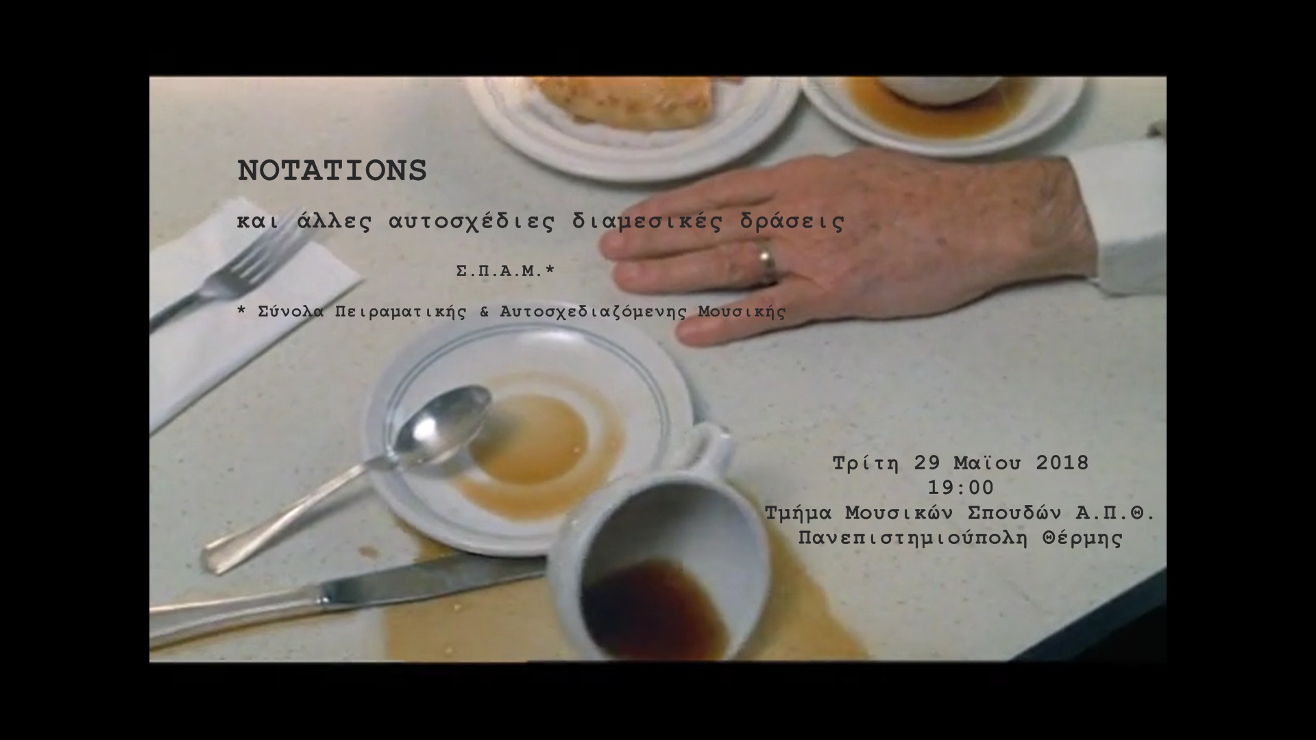 Την Τρίτη 29 Μαϊου 2018 στις 19:00, τα Σύνολα Πειραματικής & Αυτοσχεδιαζόμενης Μουσικής του Τμήματος Μουσικών Σπουδών Α.Π.Θ. παρουσιάζουν για πρώτη φορά στην Θεσσαλονίκη την βιντεο-παρτιτούρα NOTATIONS (2013) της Vicki Bennett (People Like Us) για ζωντανό αυτοσχεδιασμό.