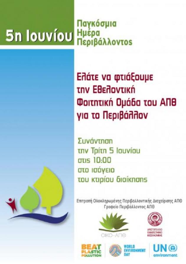 Με αφορμή τον εορτασμό της Παγκόσμιας Ημέρας Περιβάλλοντος, η Επιτροπή Ολοκληρωμένης Περιβαλλοντικής Διαχείρισης απηύθυνε ανοιχτή πρόσκληση εκδήλωσης ενδιαφέροντος για τη σύσταση Εθελοντικής Φοιτητικής Ομάδας ΑΠΘ για το Περιβάλλον που θα αναλάβει ενεργό εθελοντική δράση σε θέματα περιβαλλοντικής πολιτικής για το πανεπιστήμιο, την πανεπιστημιούπολη και την ευρύτερη πόλη.
