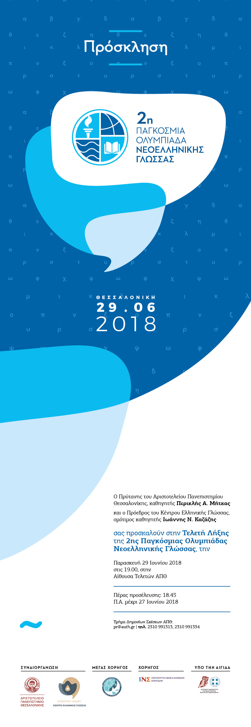 Το Αριστοτέλειο Πανεπιστήμιο Θεσσαλονίκης, το Σχολείο Νέας Ελληνικής Γλώσσας του ΑΠΘ και το Κέντρο Ελληνικής Γλώσσας, υπό την αιγίδα του Υπουργείου Παιδείας, Έρευνας και Θρησκευμάτων διοργανώνουν την 2η Παγκόσμια Ολυμπιάδα Νεοελληνικής Γλώσσας με τη χορηγία του Φιλανθρωπικού Ιδρύματος “Ιβάν Σαββίδη”.