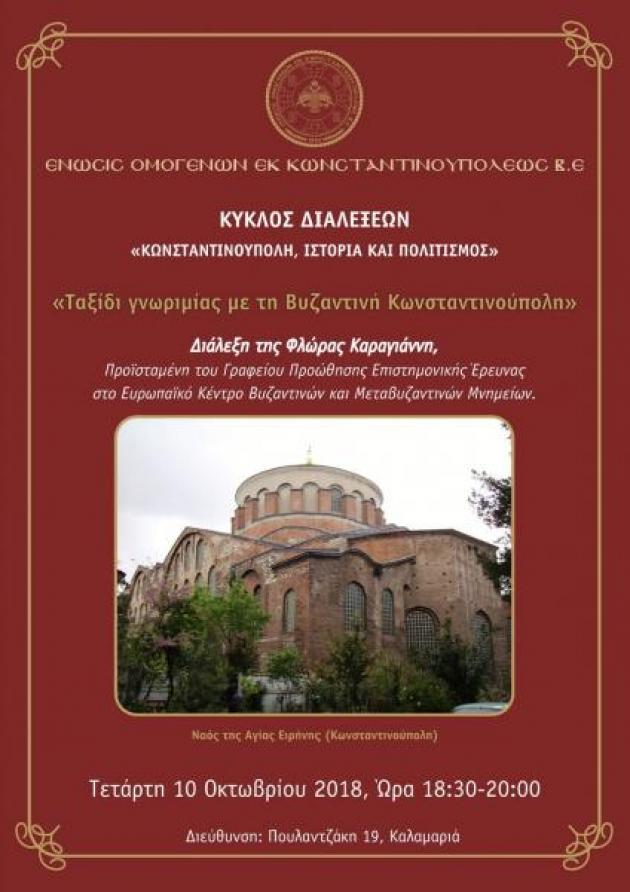 Το Διοικητικό Συμβούλιο της «Ένωσις Ομογενών εκ Κωνσταντινουπόλεως Βορείου Ελλάδος» στο πλαίσιο της δυναμικής παρέμβασης του στα πολιτιστικά και εκπαιδευτικά δρώμενα της Θεσσαλονίκης, ξεκινά κύκλο διαλέξεων με θέμα: «Κωνσταντινούπολη. Ιστορία και Πολιτισμός». Στόχος αυτών των διαλέξεων είναι να γνωρίσουν την ιστορία και τον πολιτισμό της, όχι μόνο όσοι αντλούν τις ρίζες τους από την Κωνσταντινούπολη, αλλά και το ευρύτερο κοινό της Θεσσαλονίκης. Οι διαλέξεις θα αρχίσουν την 10η Οκτωβρίου και θα λαμβάνουν χώρα κάθε δεύτερη Τετάρτη του μήνα στο εντευκτήριο μας, (Πουλαντζάκη 19, Καλαμαριά) 18.30 – 20.00. Θα απευθύνονται σε κάθε ενδιαφερόμενο. Στο πέρας του Κύκλου Διαλέξεων θα χορηγείται σχετική βεβαίωση παρακολούθησης των ομιλιών.