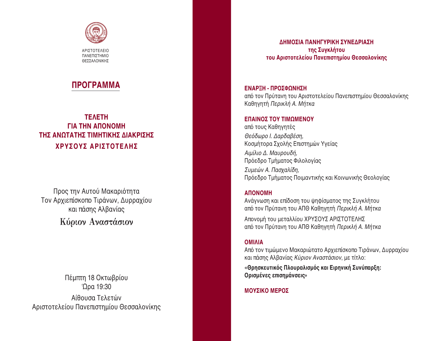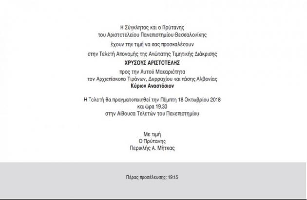 Video: Τελετή Απονομής της Ανώτατης Τιμητικής Διάκρισης ΧΡΥΣΟΥΣ ΑΡΙΣΤΟΤΕΛΗΣ στην Α.Μ. τον Αρχιεπίσκοπο Τιράνων, Δυρραχίου και πάσης Αλβανίας Κύριο Αναστάσιο