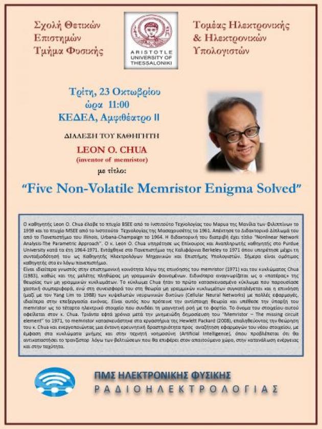 Ο κ. Leon Chua είναι αυτός που επινόησε το memristor ως το τέταρτο ηλεκτρικό στοιχείο και θα παρουσιάσει τη λειτουργία του, την εξέλιξη της θεωρίας του καθώς και εφαρμογές του.