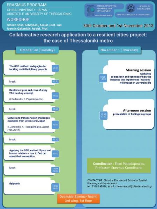 Οργανώνεται και συντονίζεται από το Τμήμα Μηχανικών Χωροταξίας και Ανάπτυξης το Εργαστήριο με τίτλο Collaborative research application to a resilient cities project: the case of Thessaloniki metro