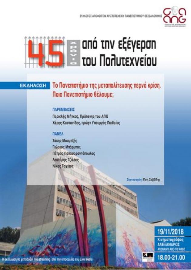 Ο Σύλλογος Αποφοίτων του Αριστοτελείου Πανεπιστημίου Θεσσαλονίκης με αφορμή τα 45 χρόνια από την εξέγερση του Πολυτεχνείου οργανώνει εκδήλωση με θέμα: 45 χρόνια από την εξέγερση του Πολυτεχνείου.