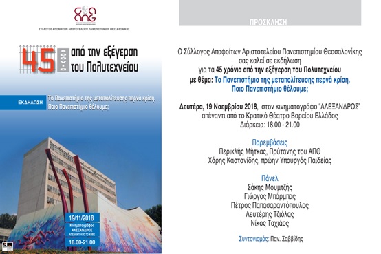 Ο Σύλλογος Αποφοίτων του Αριστοτελείου Πανεπιστημίου Θεσσαλονίκης με αφορμή τα 45 χρόνια από την εξέγερση του Πολυτεχνείου οργανώνει εκδήλωση με θέμα: 45 χρόνια από την εξέγερση του Πολυτεχνείου.