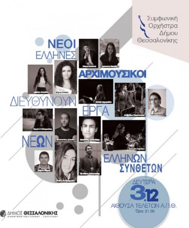 Η Συμφωνική Ορχήστρα Δήμου Θεσσαλονίκης σε συνεργασία με το Αριστοτέλειο Πανεπιστήμιο Θεσσαλονίκης και το Τμήμα Μουσικών Σπουδών του Α.Π.Θ. πραγματοποιήσει συναυλία μετά από εκπαιδευτικό εργαστήριο διάρκειας μίας εβδομάδος στο πλαίσιο της εκπαιδευτικών της δράσεων για την ανάδειξη νέων καλλιτεχνών, της προώθησης της σύγχρονης μουσικής δημιουργίας, καθώς της προσφοράς πολύτιμων εμπειριών σε νέους αρχιμουσικούς και ειδικά στην σύγχρονη μουσική και σημειογραφία. Στο εγχείρημα αυτό καθοδηγητές τους θα είναι καθηγητές σύνθεσης του Τμήματος Μουσικών Σπουδών του Α.Π.Θ. και οι αρχιμουσικοί της Σ.Ο.Δ.Θ., οι οποίοι και αποτέλεσαν τις επιτροπές μετά από πολύμηνη διαδικασία επιλογής από πολλούς νέους αρχιμουσικούς και συνθέτες έως 35 ετών που δήλωσαν συμμετοχή. Τα έργα παρουσιάζονται σε Α’ Παγκόσμια Εκτέλεση και πρόκειται να ηχογραφηθούν και βιντεοσκοπηθούν από το Τμήμα Μουσικών Σπουδών του Α.Π.Θ., του οποίου η συμβολή είναι ανεκτίμητη και όσον αφορά τον δανεισμό πολλών κρουστών οργάνων για την άρτια εκτέλεση των συνθέσεων, το δε Α.Π.Θ. παραχωρεί δωρεάν την Αίθουσα Τελετών στο πλαίσιο της συνεργασίας του με την Διεύθυνση Πολιτισμού και Τουρισμού του Δήμου Θεσσαλονίκης. Οι συνθέσεις αντλούν την θεματική τους από την πόλη ή την ιστορία της Θεσσαλονίκης. Το κοινό θα έχει την ευκαιρία να ακούσει τους ίδιους τους συνθέτες να μιλούν για τα έργα τους.
