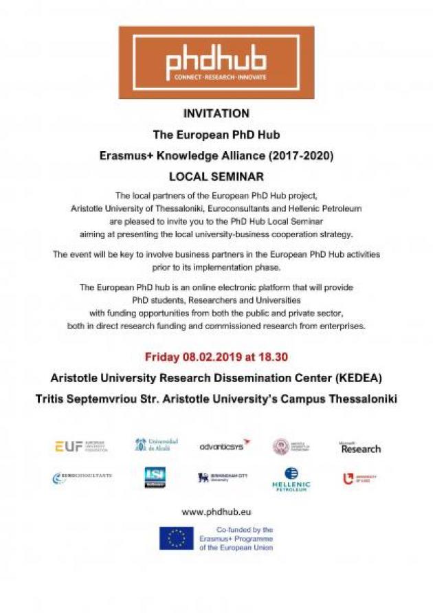 Ενημερωτικό Σεμινάριο που θα γίνει την Παρασκευή 8 Φεβρουαρίου 2019 στις 18.30 στο ΚΕΔΕΑ, στο πλαίσιο του  “European PhD Hub” Erasmus+ Knowledge Alliance (2017-2020). Πρόκειται για Ευρωπαϊκό πρόγραμμα για τη συνεργασία του Πανεπιστημίου (διδάκτορες, υποψήφιοι διδάκτορες) με τη βιομηχανία.
