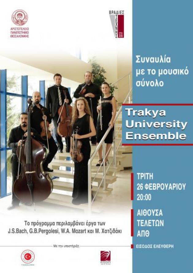 Ο Πρύτανης του Αριστοτελείου Πανεπιστημίου Θεσσαλονίκης Καθηγητής Περικλής Α. Μήτκας σας προσκαλεί στη συναυλία με το μουσικό σύνολο Trakya University Ensemble την Τρίτη 26 Φεβρουαρίου 2019 και ώρα 20:00 στην Αίθουσα Τελετών ΑΠΘ