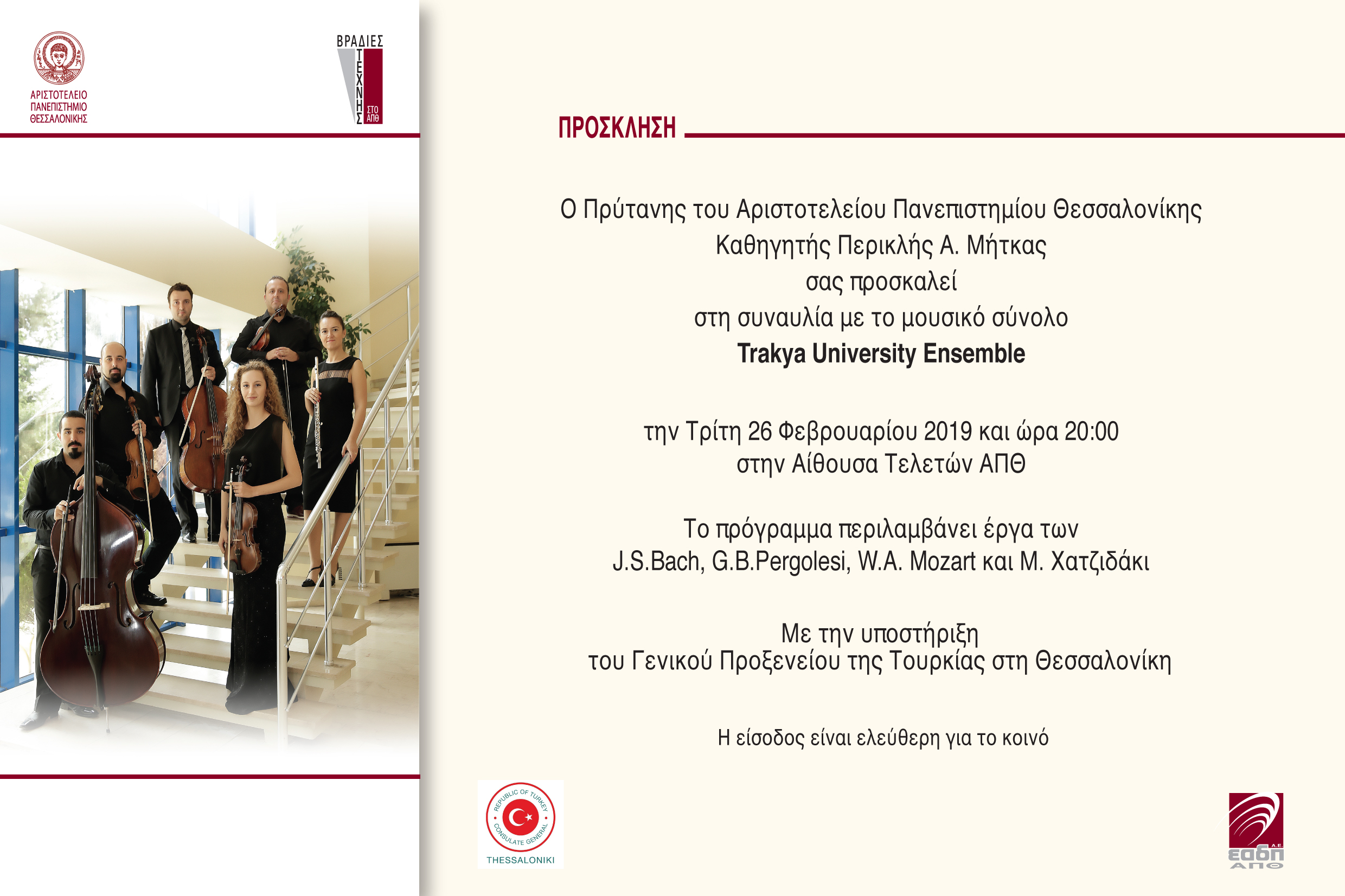 Ο Πρύτανης του Αριστοτελείου Πανεπιστημίου Θεσσαλονίκης Καθηγητής Περικλής Α. Μήτκας σας προσκαλεί στη συναυλία με το μουσικό σύνολο Trakya University Ensemble την Τρίτη 26 Φεβρουαρίου 2019 και ώρα 20:00 στην Αίθουσα Τελετών ΑΠΘ