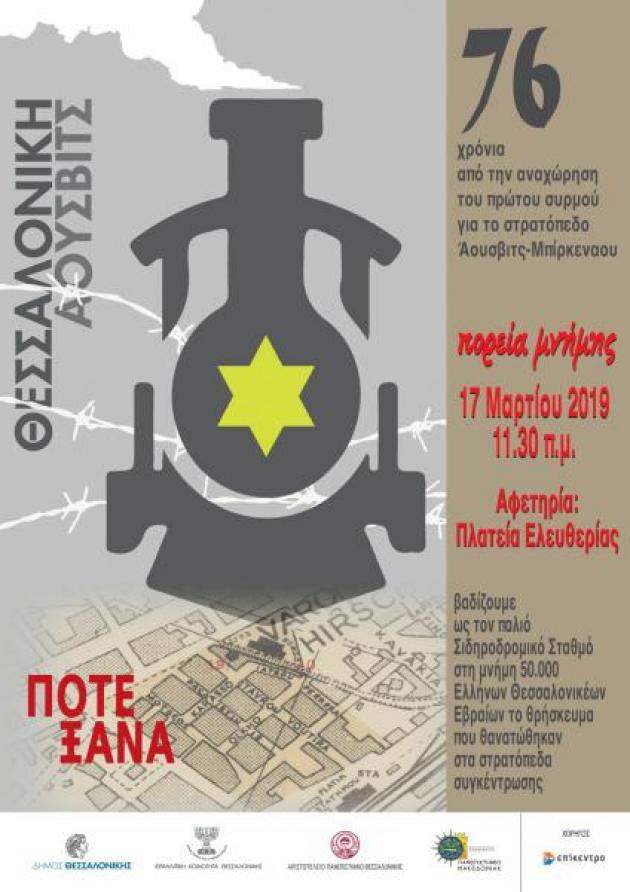 Για έβδομη συνεχή χρονιά, το Αριστοτέλειο Πανεπιστήμιο Θεσσαλονίκης συμμετέχει στις εκδηλώσεις της Πορείας Μνήμης, που καθιέρωσε ο Δήμος Θεσσαλονίκης σε συνεργασία με την Ισραηλιτική Κοινότητα Θεσσαλονίκης με συμμετοχή των Πανεπιστημίων της πόλης, με αφορμή την αναχώρηση του πρώτου συρμού για το στρατόπεδο Άουσβιτς-Μπιρκενάου, όπου θανατώθηκαν 50.000 Θεσσαλονικείς Εβραίοι.