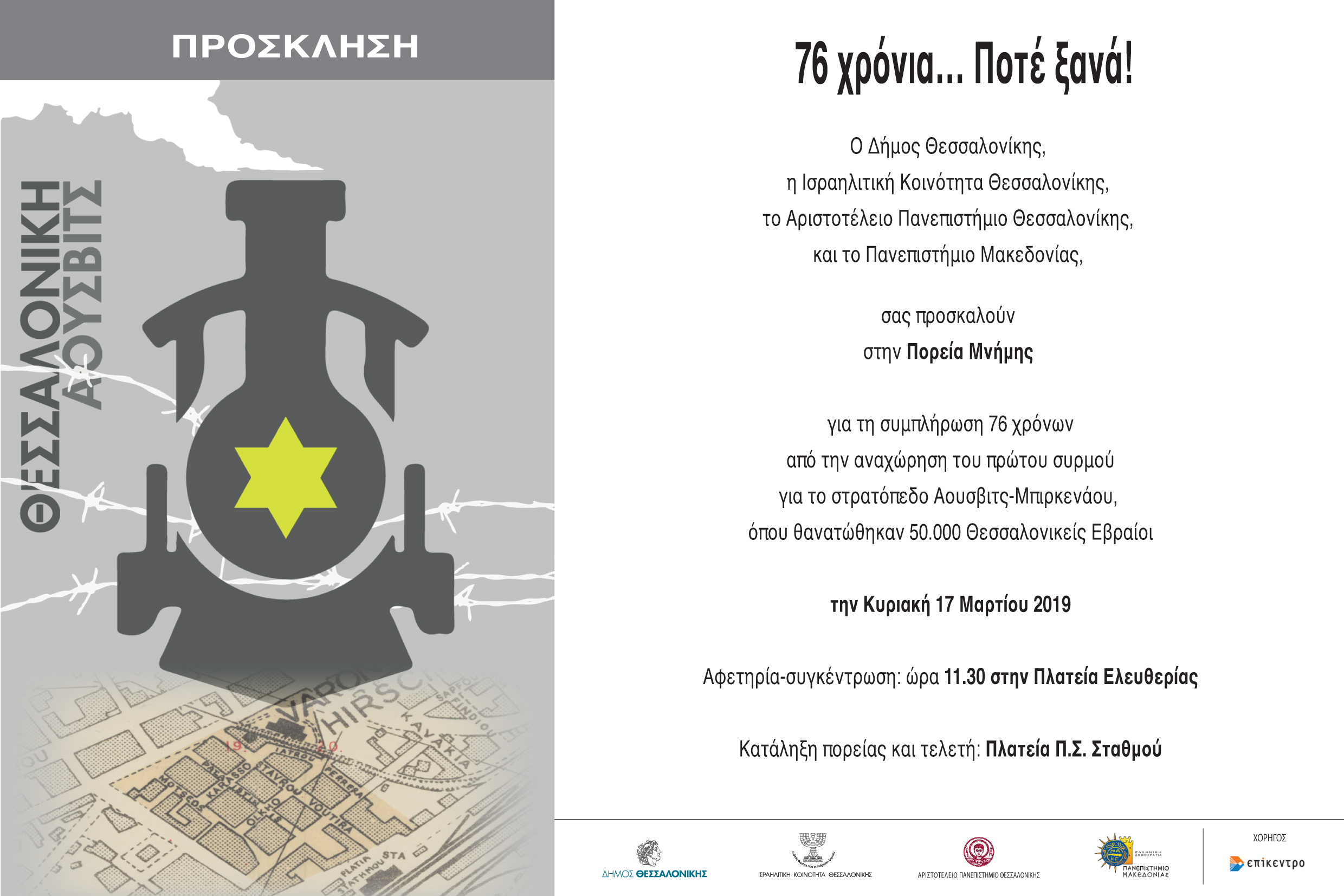 Για έβδομη συνεχή χρονιά, το Αριστοτέλειο Πανεπιστήμιο Θεσσαλονίκης συμμετέχει στις εκδηλώσεις της Πορείας Μνήμης, που καθιέρωσε ο Δήμος Θεσσαλονίκης σε συνεργασία με την Ισραηλιτική Κοινότητα Θεσσαλονίκης με συμμετοχή των Πανεπιστημίων της πόλης, με αφορμή την αναχώρηση του πρώτου συρμού για το στρατόπεδο Άουσβιτς-Μπιρκενάου, όπου θανατώθηκαν 50.000 Θεσσαλονικείς Εβραίοι.