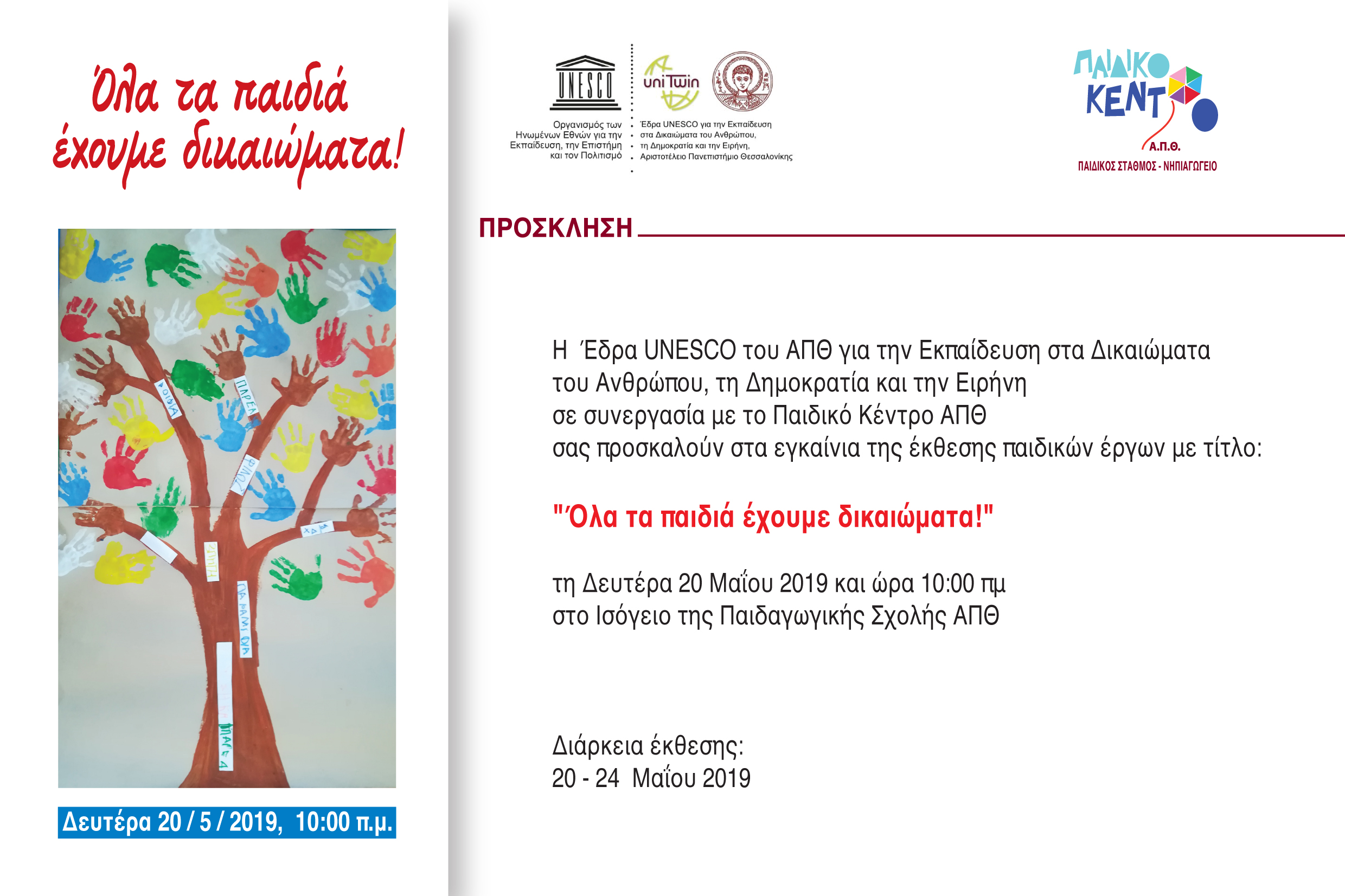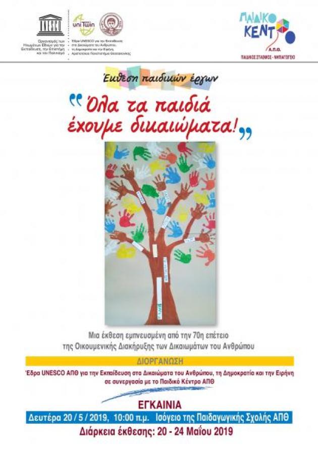 Στο πλαίσιο αυτό, η Έδρα UNESCO οργανώνει σε συνεργασία με το Παιδικό Κέντρο του ΑΠΘ την Έκθεση παιδικών έργων με θέμα «Όλα τα παιδιά έχουμε δικαιώματα!» από τη Δευτέρα 20 Μαΐου έως την Παρασκευή 24 Μαΐου 2019 στο Ισόγειο της Παιδαγωγικής Σχολής του ΑΠΘ. Τα εγκαίνια της έκθεσης θα πραγματοποιηθούν τη Δευτέρα 20 Μαΐου 2019, στις 10:00, στον ίδιο χώρο. Στο πλαίσιο της Έκθεσης θα παρουσιαστούν τα έργα των παιδιών του Παιδικού Κέντρου που προέκυψαν από την εκπαιδευτική δράση με θέμα τα ανθρώπινα δικαιώματα, η οποία υλοποιήθηκε κατά τη διάρκεια του ακαδημαϊκού/σχολικού έτους 2018-2019, με πρωτοβουλία της Έδρας UNESCO, στο πλαίσιο της 70ης επετείου της Οικουμενικής Διακήρυξης των Δικαιωμάτων του Ανθρώπου (1948-2018).