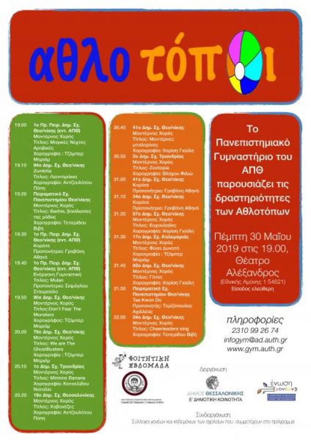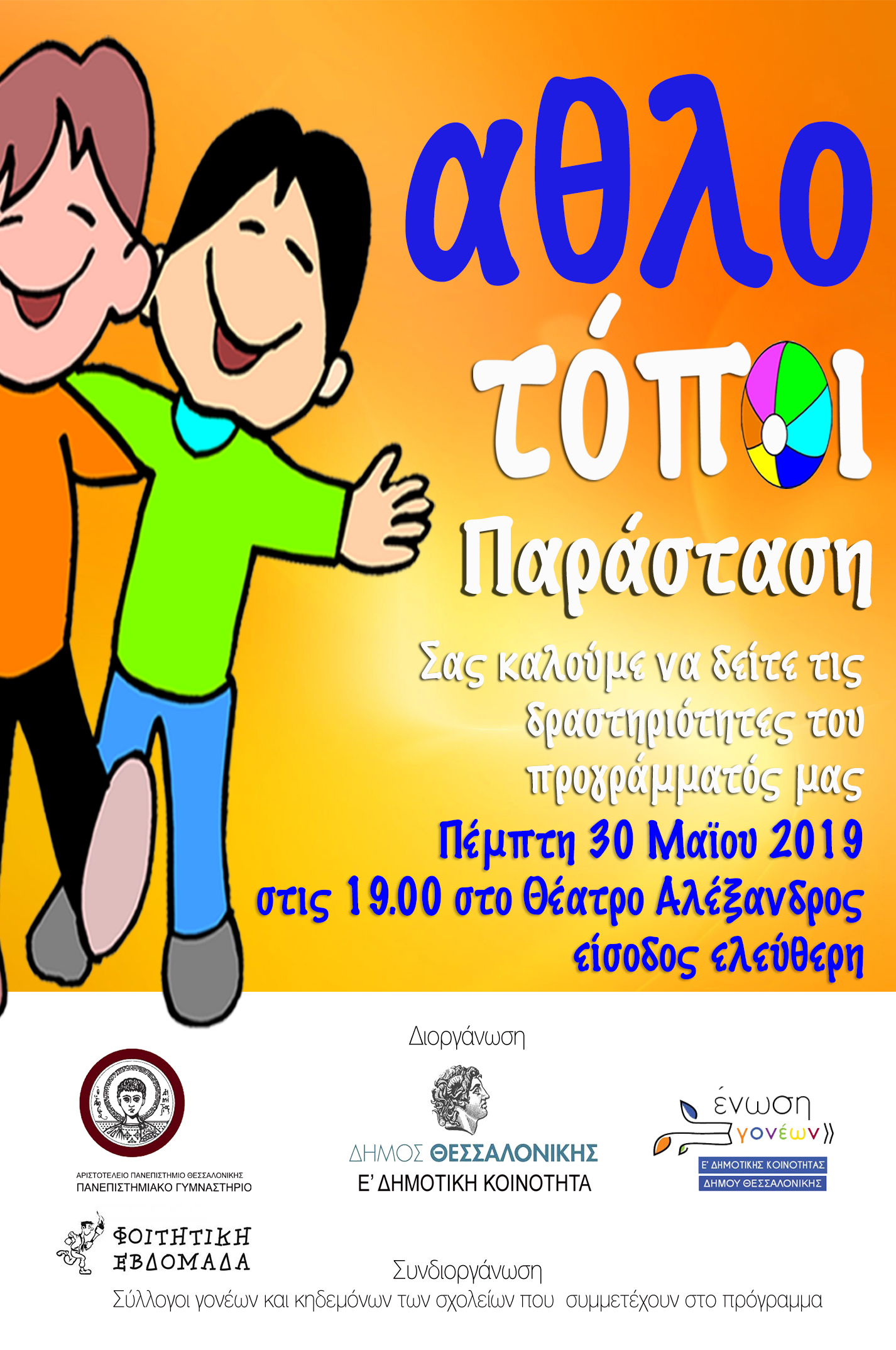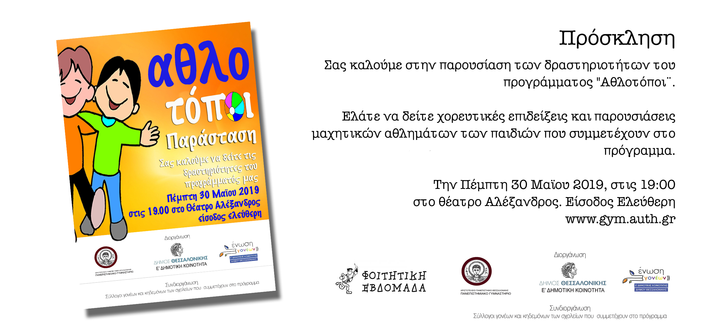 Σας καλούμε στην παρουσίαση των δραστηριοτήτων του προγράμματος “Αθλοτόποι¨. 18 τμήματα από 13 Δημοτικά Σχολεία θα παρουσιάσουν χορευτικές επιδείξεις και παρουσιάσεις μαχητικών αθλημάτων των παιδιών που συμμετέχουν στο πρόγραμμα.
