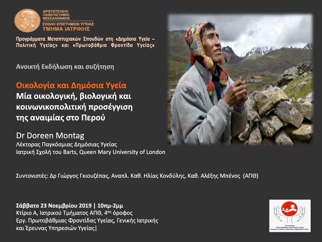 Διάλεξη και σεμινάριο με θέμα:”Οικολογία και δημόσια υγεία: μια οικολογική, βιολογική και κοινωνικοοικονομική προσέγγιση της αναιμίας στο Περού”