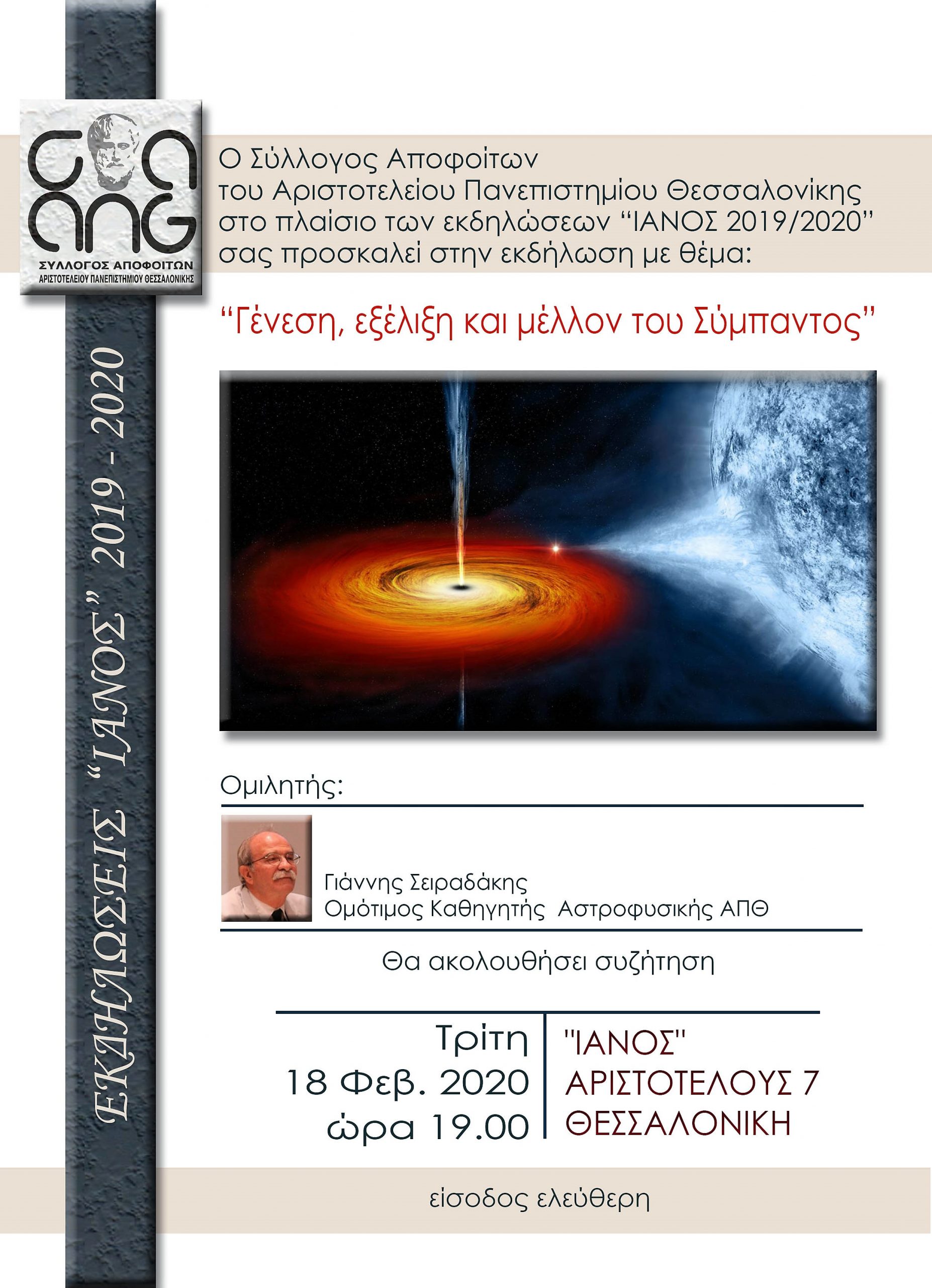 θα μιλήσει, ο Ομότιμος Καθηγητής Αστροφυσικής ΑΠΘ, Γιάννης Σειραδάκης με θέμα: “Γένεση, εξέλιξη και μέλλον του Σύμπαντος”