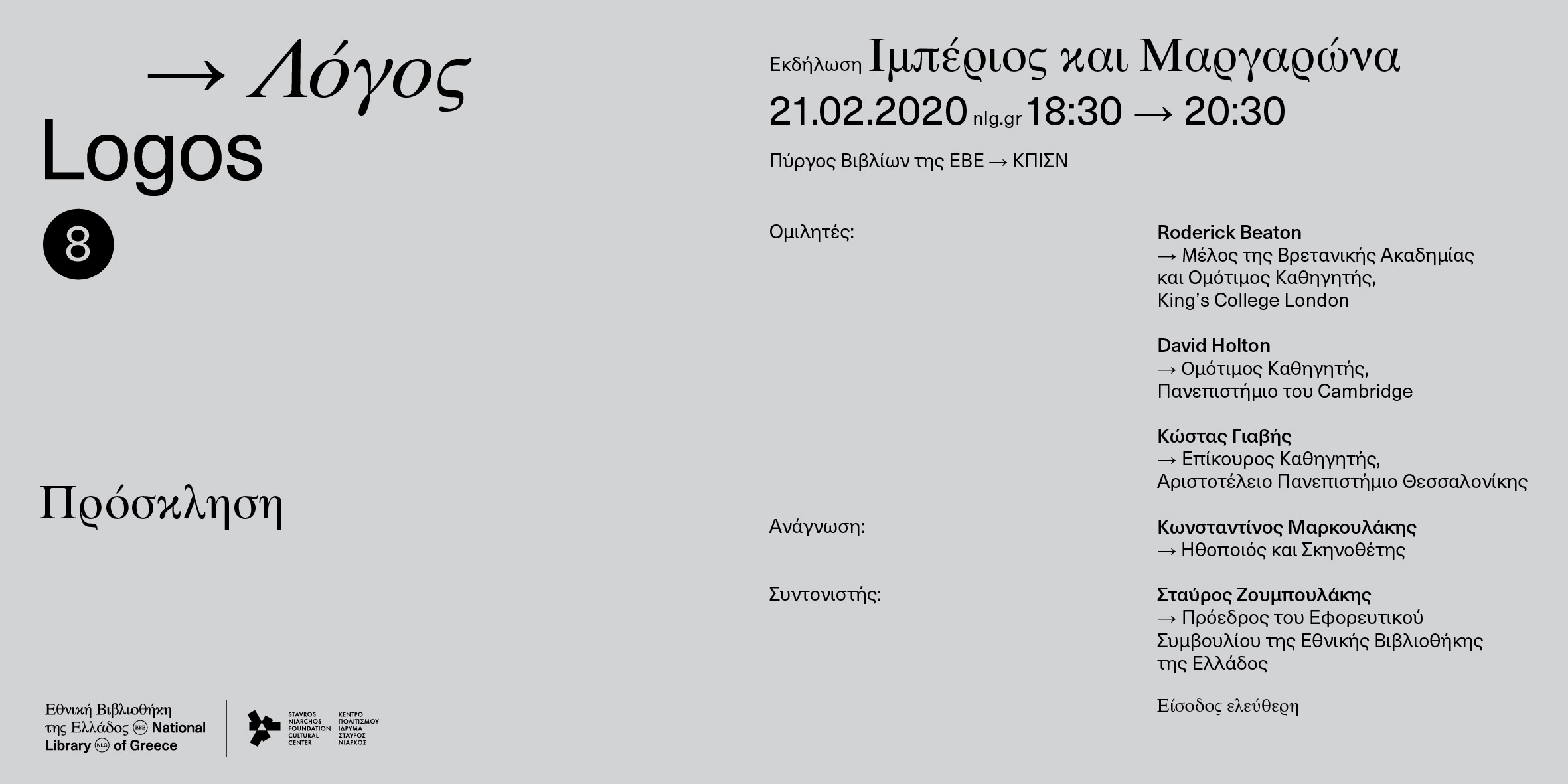 *Οι ίδιοι καθηγητές θα μιλήσουν για τη μυθιστορία “Ιμπέριος και Μαργαρώνα” και στην Αθήνα στις 21 Φεβρουαρίου 2020, ώρα 18.30,