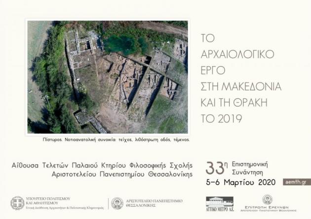 Mε 62 ανακοινώσεις και 162 συνέδρους θα πραγματοποιηθεί στις 5 και 6 Μαρτίου 2020 στην Αίθουσα Τελετών του παλαιού κτηρίου της Φιλοσοφικής Σχολής του Αριστοτελείου Πανεπιστημίου Θεσσαλονίκης η ετήσια συνάντηση για τις αρχαιολογικές εργασίες του 2019 στη Mακεδονία και τη Θράκη, που συνδιοργανώνεται από το Υπουργείο Πολιτισμού και Αθλητισμού και το Αριστοτέλειο Πανεπιστήμιο Θεσσαλονίκης (Τμήμα Ιστορίας και Αρχαιολογίας).