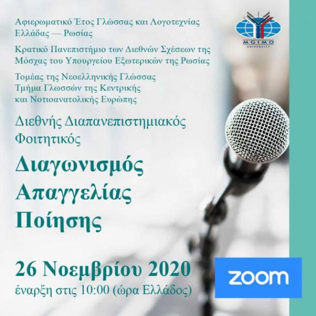 Στο πλαίσιο του Αφιερωματικού Ετους 2019-2020 Γλώσσας & Λογοτεχνίας Ελλάδας-Ρωσίας διοργανώνεται διεθνής διαπανεπιστημιακός φοιτητικός διαγωνισμός απαγγελίας ποίησης την Πέμπτη 26 Νοεμβρίου 2020