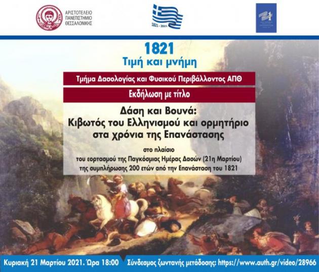 Η εκδήλωση πραγματοποιείται στο πλαίσιο του εορτασμού της Παγκόσμιας Ημέρας Δασών (21η Μαρτίου) και της συμπλήρωσης 200 ετών από την Επανάσταση του 1821.