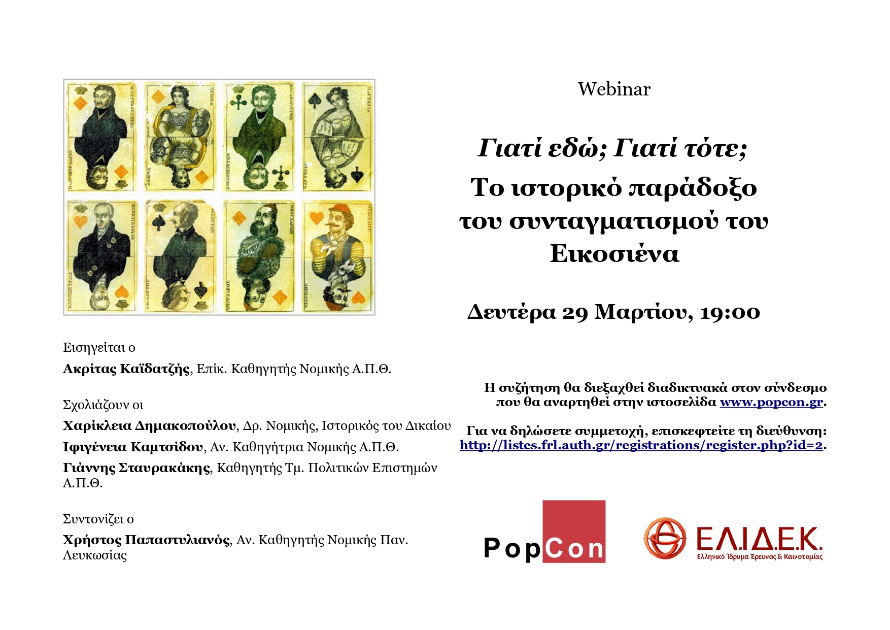 Μια διαδικτυακή εκδήλωση για τον συνταγματισμό του εικοσιένα που θα προβληθεί στις θα προβληθεί εδώ στις 29 Μαρτίου, 19:00-21:00.