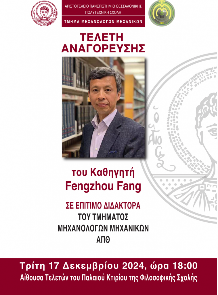 Το Τμήμα Μηχανολόγων Μηχανικών του ΑΠΘ αναγορεύει τον Dr. Fengzhou Fang, διακεκριμένο Πανεπιστημιακό Καθηγητή στο Tianjin University και στο University College Dublin, σε Επίτιμο Διδάκτορα του Τμήματος, την Τρίτη 17 Δεκεμβρίου 2024, ώρα 18:00, στην Αίθουσα Τελετών του Παλαιού Κτιρίου της Φιλοσοφικής Σχολής του ΑΠΘ