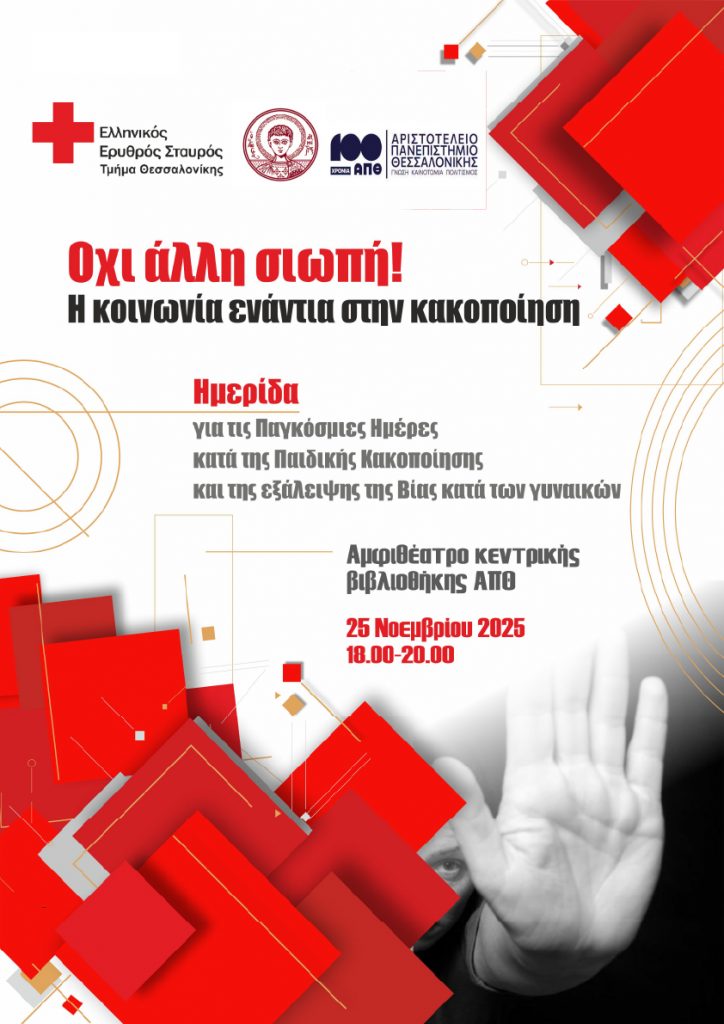Θα θέλαμε να σας ενημερώσουμε ότι, το Παράρτημα Θεσσαλονίκης του Ελληνικού Ερυθρού Σταυρού σε συνεργασία με το ΑΠΘ & ειδικότερα με την Επιτροπή Υγείας, διοργανώνει δράση ενημέρωσης και ευαισθητοποίησης με επίκεντρο την παιδική κακοποίηση και την έμφυλη βία με αφορμή τον διπλό συμβολισμό του Νοεμβρίου, έναν μήνα στον οποίο εμπεριέχονται τόσο η Παγκόσμια Ημέρα κατά της Παιδικής Κακοποίησης (19 του μηνός), όσο και η Παγκόσμια Ημέρα για την Εξάλειψη της βίας κατά των Γυναικών (25 του μηνός).