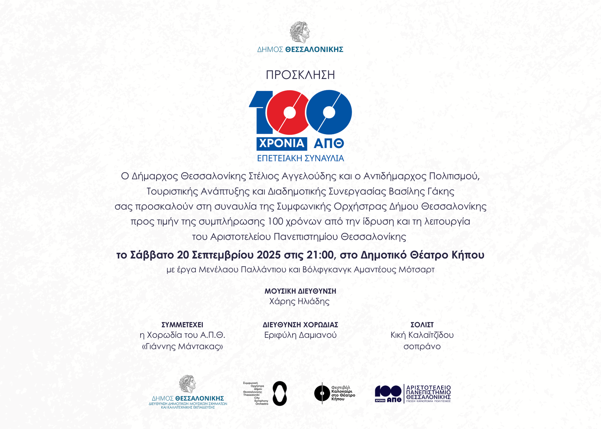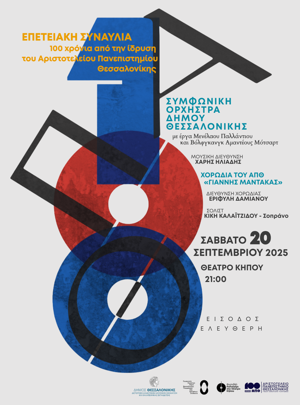 Η Συμφωνική Ορχήστρα Δήμου Θεσσαλονίκης τιμά τα 100 χρόνια από την Ίδρυση του Αριστοτελείου Πανεπιστημίου Θεσσαλονίκης με μια μεγάλη συναυλία στο Δημοτικό Θέατρο Κήπου με τη συμμετοχή της Χορωδίας του ΑΠΘ «Γιάννης Μάντακας»