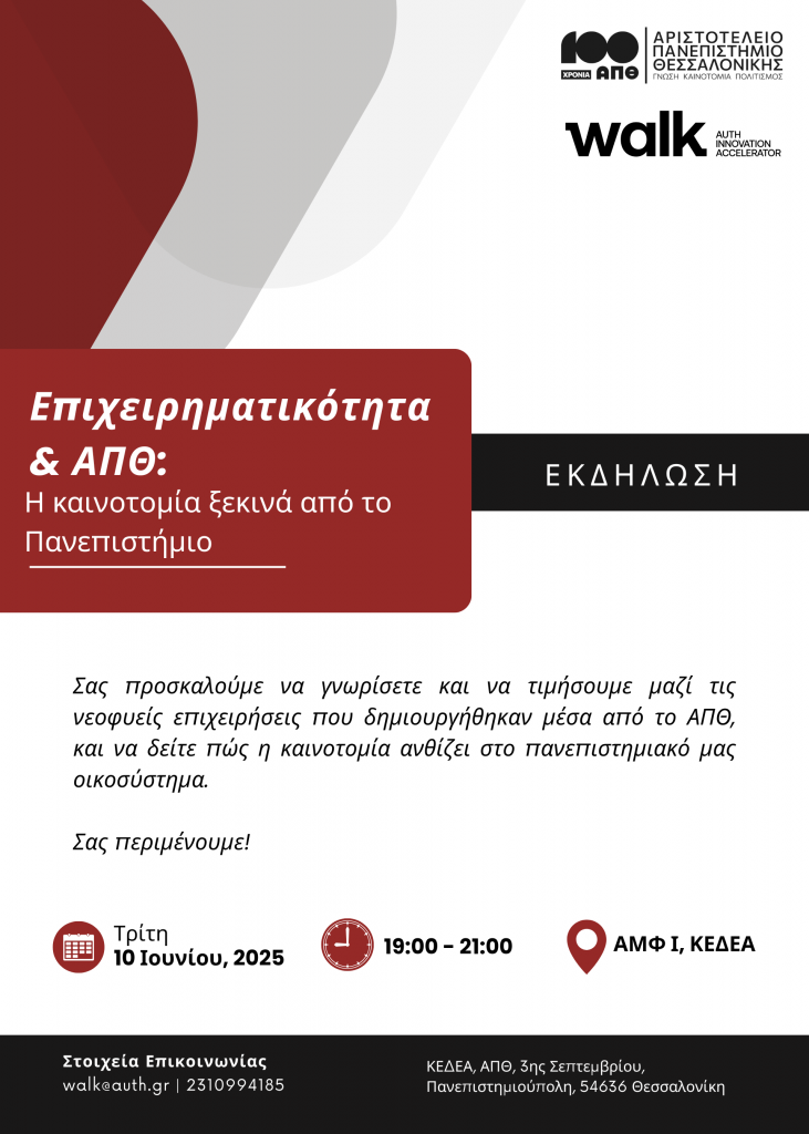 Το Αριστοτέλειο Πανεπιστήμιο Θεσσαλονίκης σας προσκαλεί στην εκδήλωση “Επιχειρηματικότητα & ΑΠΘ: Η καινοτομία ξεκινά από το Πανεπιστήμιο”, η οποία θα πραγματοποιηθεί την Τρίτη 10 Ιουνίου 2025, από τις 19:00 έως τις 21:00, στο ΑΜΦ Ι, ΚΕΔΕΑ.