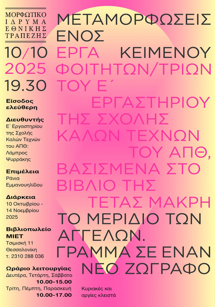 Το Μορφωτικό Ίδρυμα Εθνικής Τραπέζης σε συνεργασία με το Ε΄ Εργαστήριο* του Τμήματος Εικαστικών και Εφαρμοσμένων Τεχνών της Σχολής Καλών Τεχνών του Α.Π.Θ. παρουσιάζουν την έκθεση Μεταμορφώσεις ενός κειμένου. Ταέργα δημιουργήθηκαν με έναυσμα την διάλεξη της Τέτας Μακρή, ομότιμης καθηγήτριας της Σχολής Καλών Τεχνών ΑΠΘ, για το βιβλίο της Το μερίδιο των αγγέλων. Γράμμα σε έναν νέο ζωγράφο (εκδ. Μελάνι).