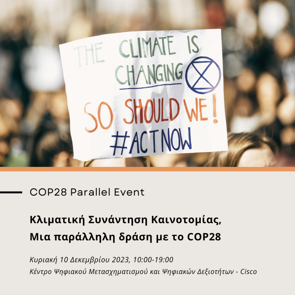 Οι ελληνικές ομάδες των οργανισμών Το Μωσαϊκό του Κλίματος – Climate Fresk Greece και YES-Europe Greece (Young leaders in Energy and Sustainability) και το Δίκτυο Νέων των Ηνωμένων Εθνών για την προώθηση λύσεων βιώσιμης ανάπτυξης στην περιοχή της Μαύρης Θάλασσας (UN Sustainable Development Solutions Network – SDSN Youth Black Sea) ενώνουν τις δυνάμεις τους για την διοργάνωση της εκδήλωσης «Κλιματική Συνάντηση Καινοτομίας – Μια παράλληλη δράση με το COP28», η οποία λαμβάνει χώρα παράλληλα με την Παγκόσμια Συνδιάσκεψη για το Κλίμα (COP28), που διεξάγεται μεταξύ 30 Νοεμβρίου και 12 Δεκεμβρίου 2023.
