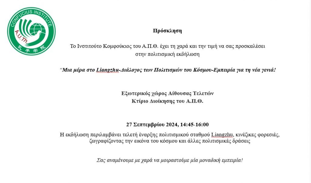 “Μια μέρα στο Liangzhu”, Διάλογος των παγκόσμιων πολιτισμών. Πολιτιστική εκδήλωση από το Ινστιτούτο Κομφούκιος ΑΠΘ