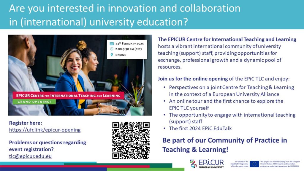 Σας προσκαλούμε στην εναρκτήρια εκδήλωση του EPICUR Centre for International Teaching & Learning (EPiC TLC), η οποία θα πραγματοποιηθεί διαδικτυακά, την Παρασκευή 23 Φεβρουαρίου 2024 και ώρα 15.00 – 16.30 (ώρα Ελλάδας).