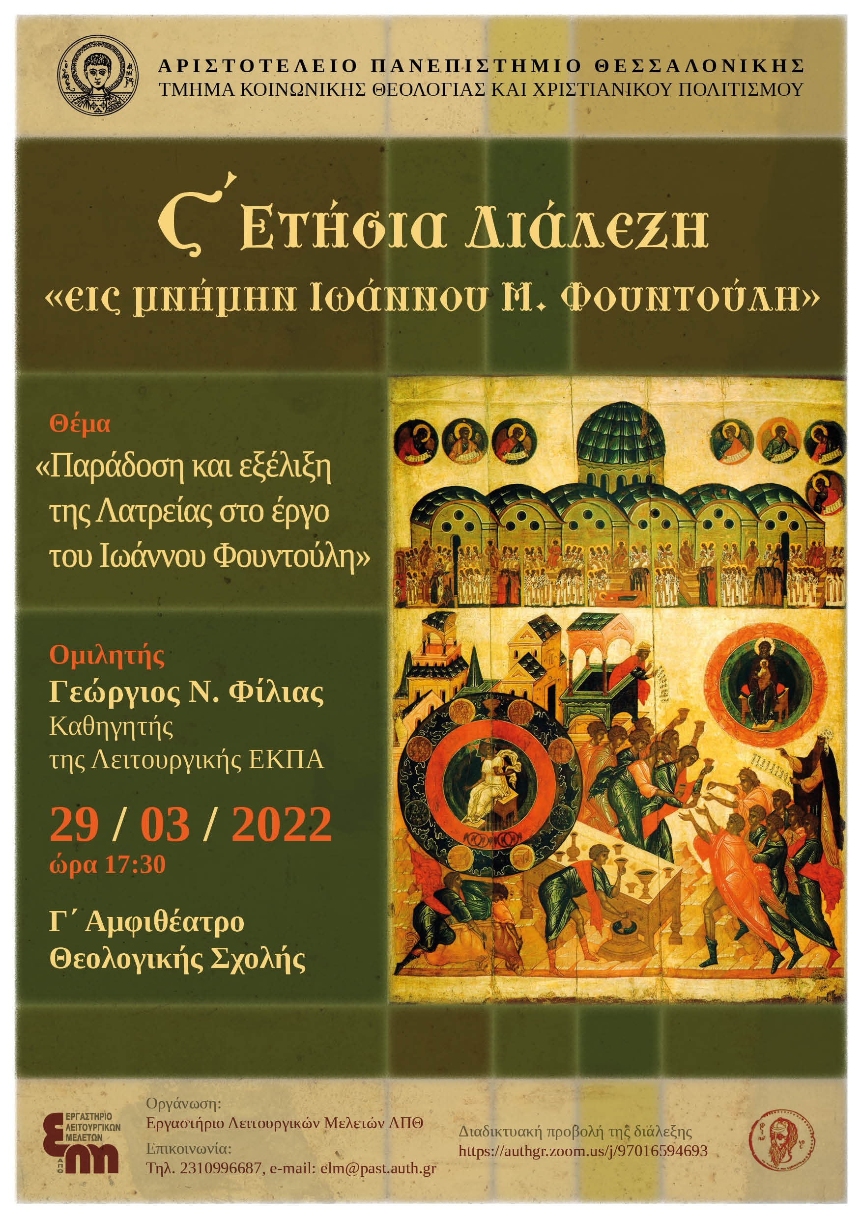 Το Τμήμα Κοινωνικής Θεολογίας και Χριστιανικού Πολιτισμού της Θεολογικής Σχολής του ΑΠΘ ανακοινώνει τη διοργάνωση της Στ ‘ Ετήσιας Διάλεξης «εις μνήμην Ιωάννου Μ. Φουντούλη». Φέτος η Διάλεξη θα πραγματοποιηθεί την Τρίτη 29 Μαρτίου 2022 και ώρα 17:30 στον Γ’ Αμφιθέατρο της Θεολογικής Σχολής. Η Διάλεξη θα προβληθεί και μέσω της εφαρμογής zoom στον εξής σύνδεσμο: