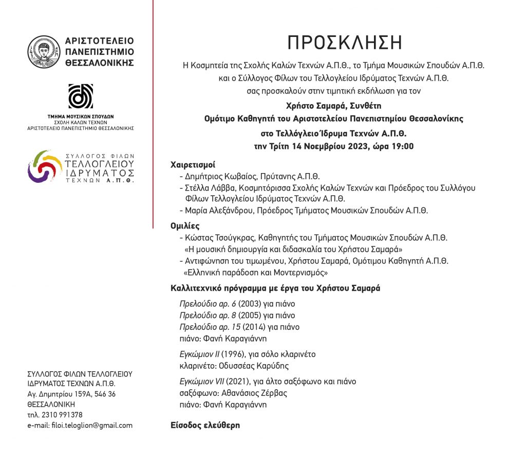 Η τιμητική εκδήλωση για τον Χρήστο Σαμαρά, Συνθέτη, Ομότιμο Καθηγητή του ΑΠΘ θα πραγματοποιηθεί στο Τελλόγλειο Ίδρυμα Τεχνών ΑΠΘ την Τρίτη 14 Νοεμβρίου 2023, ώρα 19:00.
