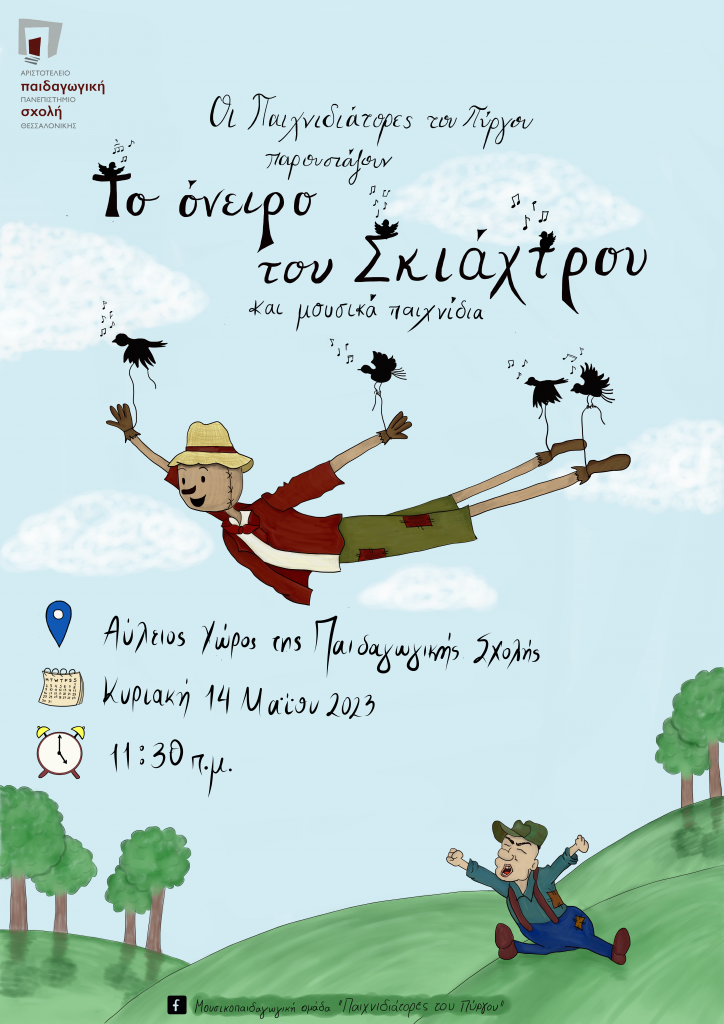 Η Μουσικοπαιδαγωγική Ομάδα «Παιχνιδιάτορες του Πύργου» της Παιδαγωγικής Σχολής του ΑΠΘ παρουσιάζει την παράσταση «Το όνειρο του σκιάχτρου και μουσικά παιχνίδια». Η παράσταση θα πραγματοποιηθεί την Κυριακή 14 Μαΐου στις 11.30πμ στον αύλειο χώρο της Παιδαγωγικής Σχολής και είναι ανοιχτή στο κοινό της πόλης.
