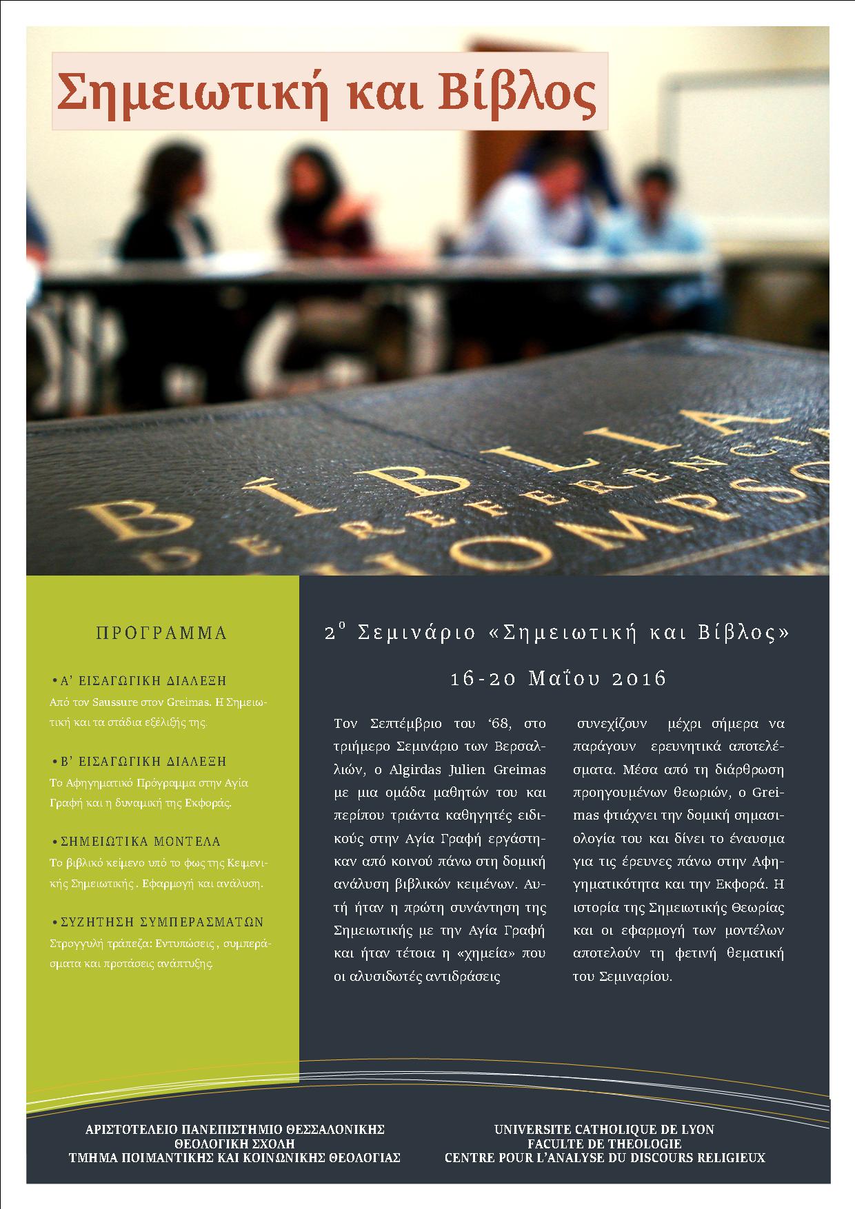 Οι ημερομηνίες διεξαγωγής είναι 16 – 20 Μαΐου 2016 στη Θεολογική Σχολή Θεσσαλονίκης και θα διδάξει ο π. Γεώργιος Βασιλάκης, PhD Candidate in Theology and Semiotics, Catholic University of Lyon, CADIR – Center for the Analysis of Religious Discourse.