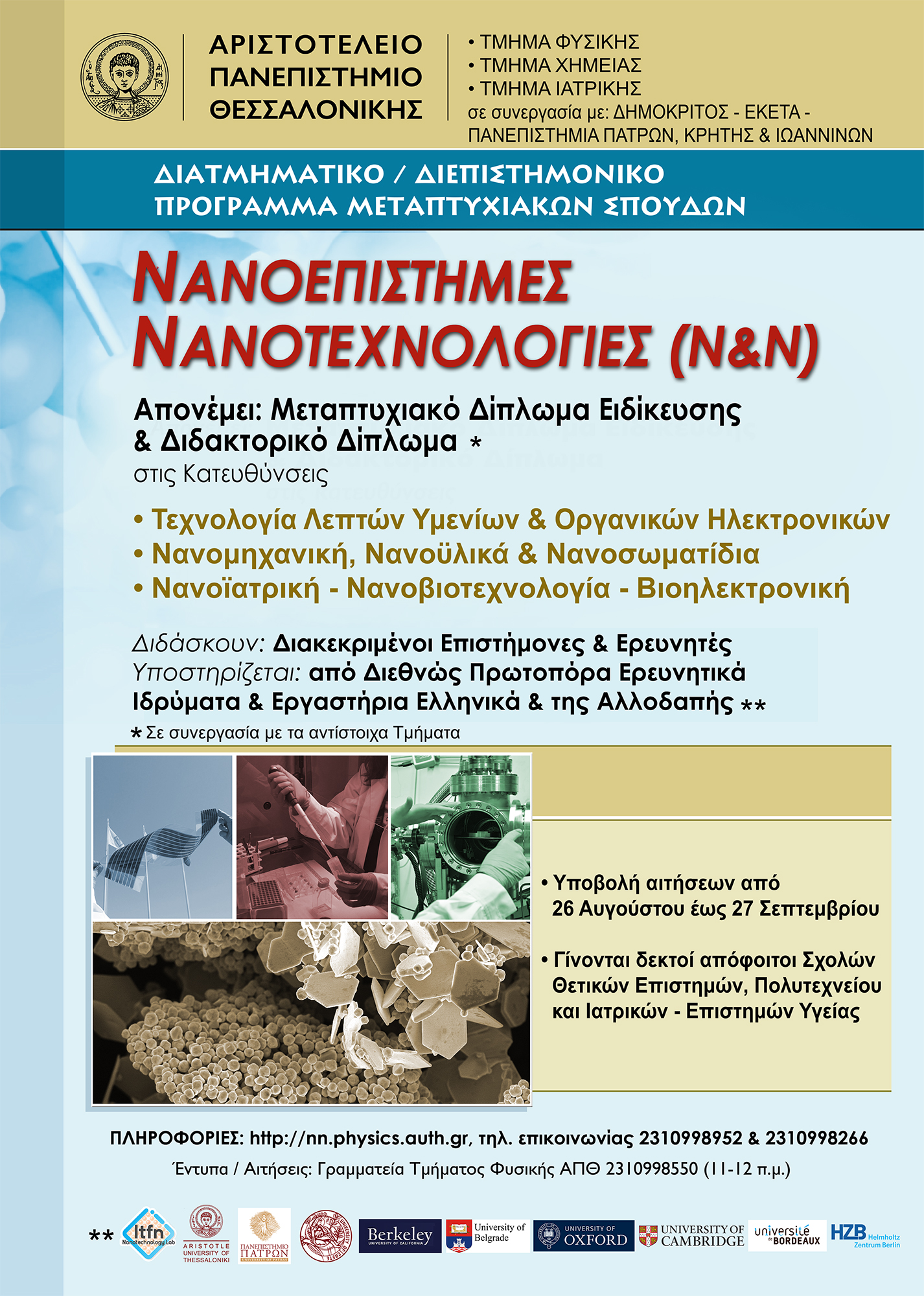 Το Τµήµα Φυσικής Α.Π.Θ. ανακοινώνει τις διαδικασίες αξιολόγησης των υποψηφίων µεταπτυχιακών Φοιτητών στο Διεπιστημονικό – Διατμηματικό Πρόγραµµα Μεταπτυχιακών Σπουδών “Νανοεπιστήμες και Νανοτεχνολογίες” (ΔΠΜΣ Ν&Ν) (nn.physics.auth.gr).