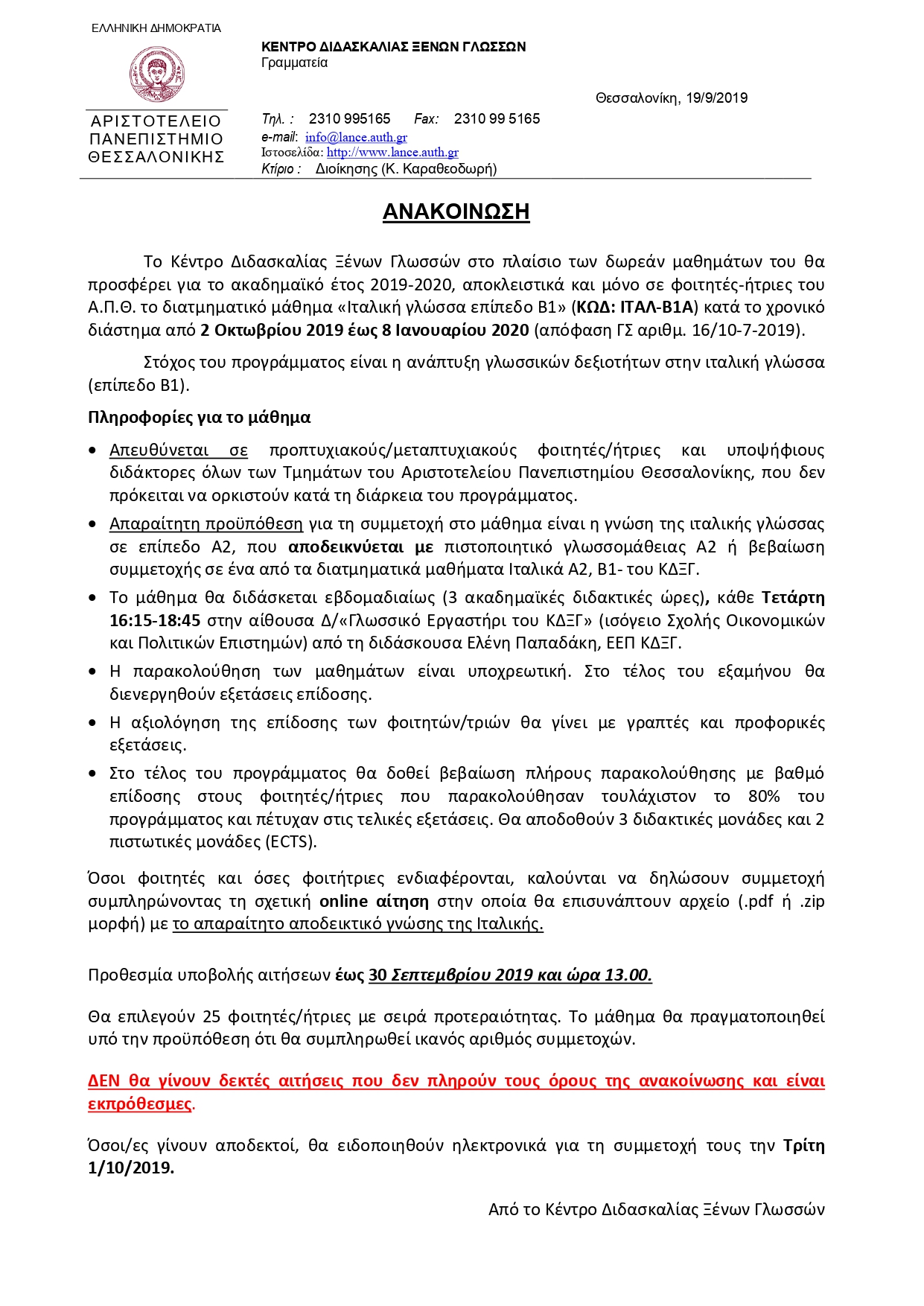 Το Κέντρο Διδασκαλίας Ξένων Γλωσσών στο πλαίσιο των δωρεάν μαθημάτων του θα προσφέρει για το ακαδημαϊκό έτος 2019-2020, αποκλειστικά και μόνο σε φοιτητές-ήτριες του Α.Π.Θ. το διατμηματικό μάθημα «Ιταλική γλώσσα επίπεδο Β1» κατά το χρονικό διάστημα από 2 Οκτωβρίου 2019 έως 21 Μαΐου 2020 (απόφαση ΓΣ αριθμ. 16/10-7-2019).