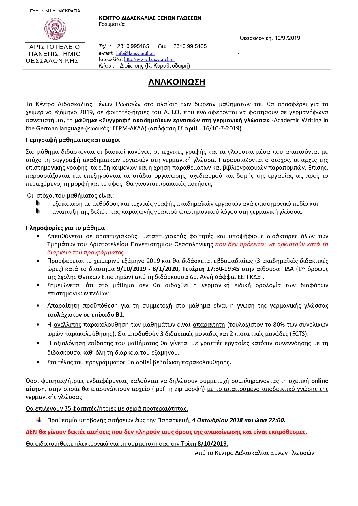Το Κέντρο Διδασκαλίας Ξένων Γλωσσών στο πλαίσιο των δωρεάν μαθημάτων του θα προσφέρει για το χειμερινό εξάμηνο 2019, σε φοιτητές-ήτριες του Α.Π.Θ. που ενδιαφέρονται να φοιτήσουν σε γερμανόφωνα πανεπιστήμια, το μάθημα «Συγγραφή ακαδημαϊκών εργασιών στη γερμανική γλώσσα» -Academic Writing in the German language (κωδικός: ΓΕΡΜ-ΑΚΑΔ) (απόφαση ΓΣ αριθμ.16/10-7-2019).