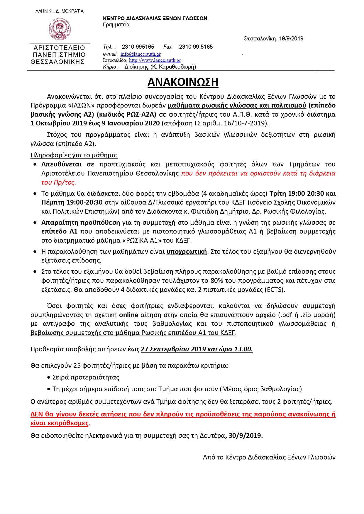 Ανακοινώνεται ότι στο πλαίσιο συνεργασίας του Κέντρου Διδασκαλίας Ξένων Γλωσσών με το Πρόγραμμα «ΙΑΣΩΝ» προσφέρονται δωρεάν μαθήματα ρωσικής γλώσσας και πολιτισμού (επίπεδο βασικής γνώσης A2) (κωδικός ΡΩΣ-Α2Α) σε φοιτητές/ήτριες του Α.Π.Θ. κατά το χρονικό διάστημα 1 Οκτωβρίου 2019 έως 9 Ιανουαρίου 2020 (απόφαση ΓΣ αριθμ. 16/10-7-2019).
