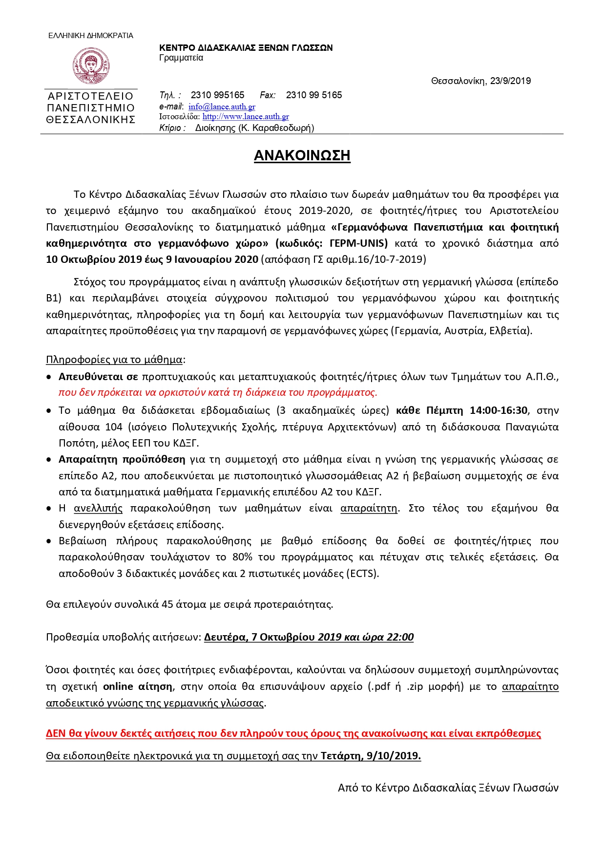 Το Κέντρο Διδασκαλίας Ξένων Γλωσσών στο πλαίσιο των δωρεάν μαθημάτων του θα προσφέρει για το χειμερινό εξάμηνο του ακαδημαϊκού έτους 2019-2020, σε φοιτητές/ήτριες του Αριστοτελείου Πανεπιστημίου Θεσσαλονίκης το διατμηματικό μάθημα «Γερμανόφωνα Πανεπιστήμια και φοιτητική καθημερινότητα στο γερμανόφωνο χώρο» (κωδικός: ΓΕΡΜ-UNIS) κατά το χρονικό διάστημα από 10 Οκτωβρίου 2019 έως 9 Ιανουαρίου 2020 (απόφαση ΓΣ αριθμ.16/10-7-2019)