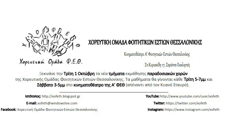 Η Χορευτική Ομάδα Φοιτητικών Εστιών Θεσσαλονίκης – Χ.Ο.Φ.Ε.Θ σας προσκαλεί την Τρίτη 1 Οκτωβρίου 2019 και ώρα: 17:00 στο Κινηματοθέατρο Α’ Φοιτητικής Εστίας Θεσσαλονίκης για την έναρξη των μαθημάτων και τη δημιουργία νέων τμημάτων για το χορευτικό έτος 2019-2020.